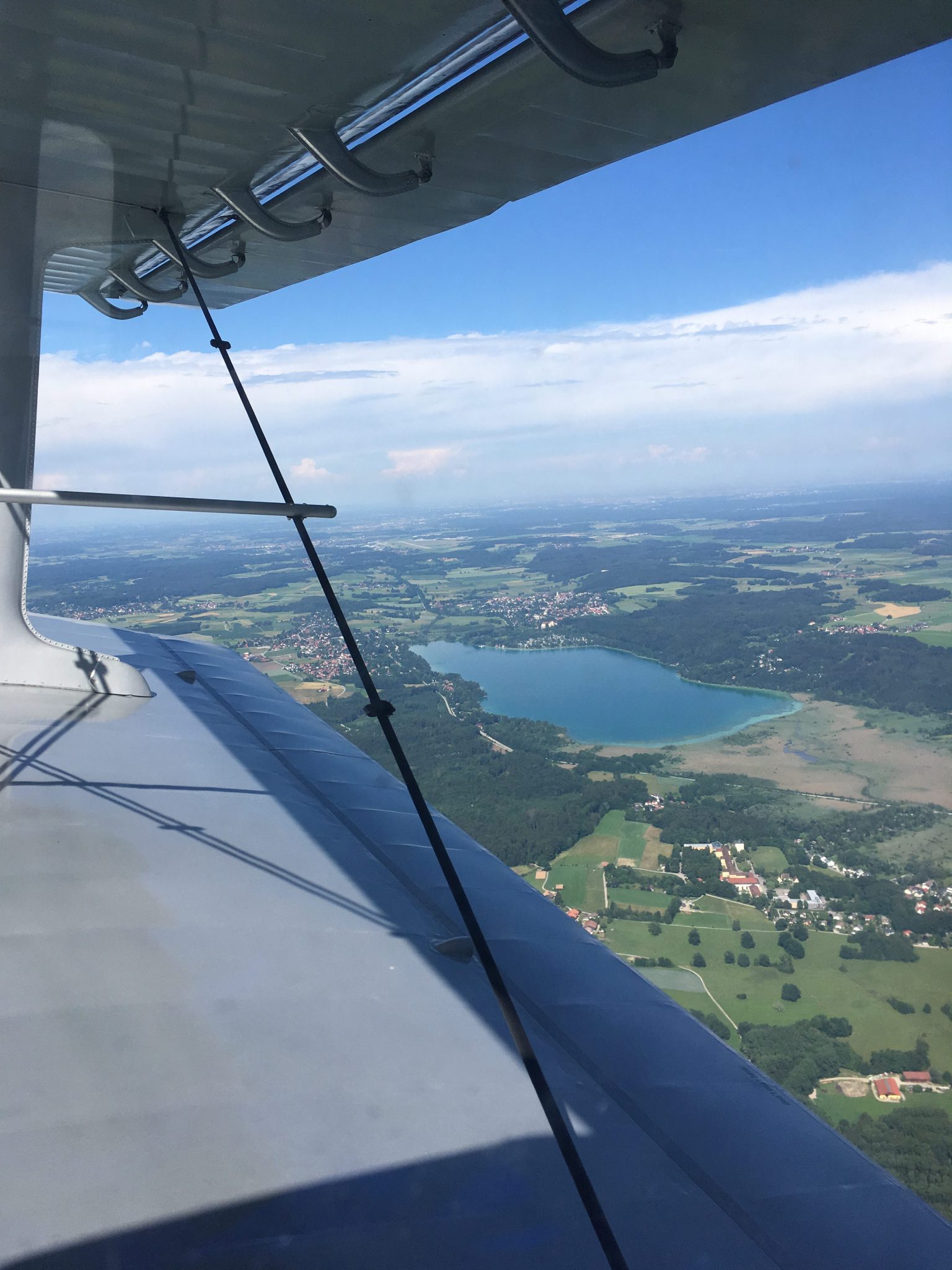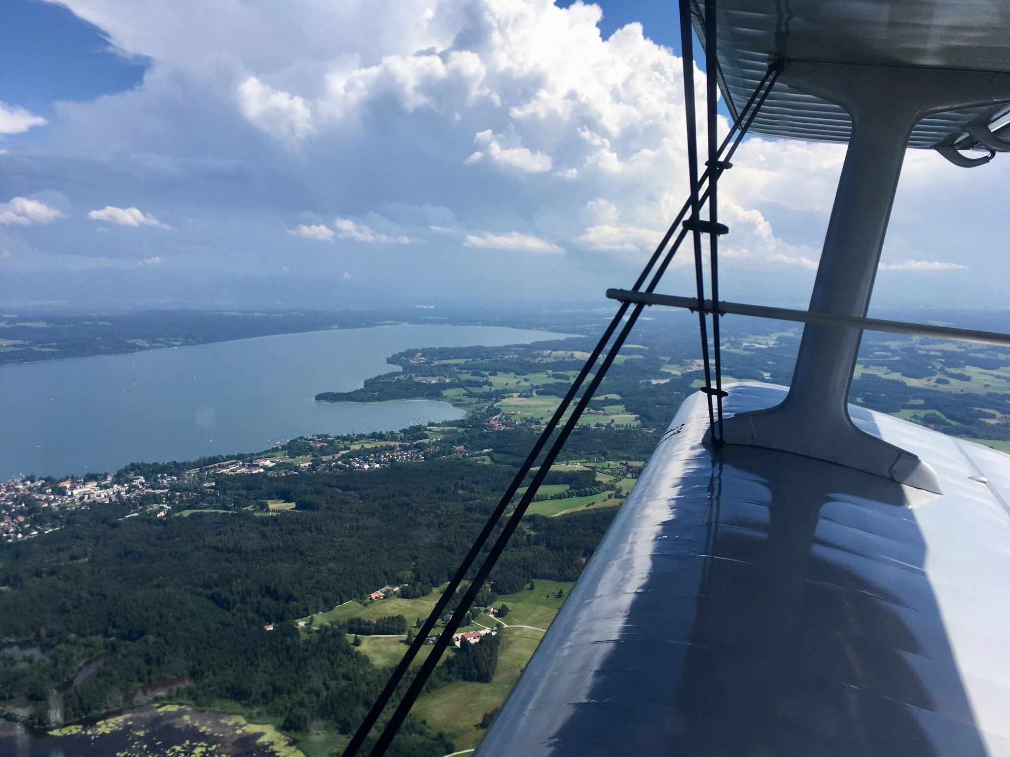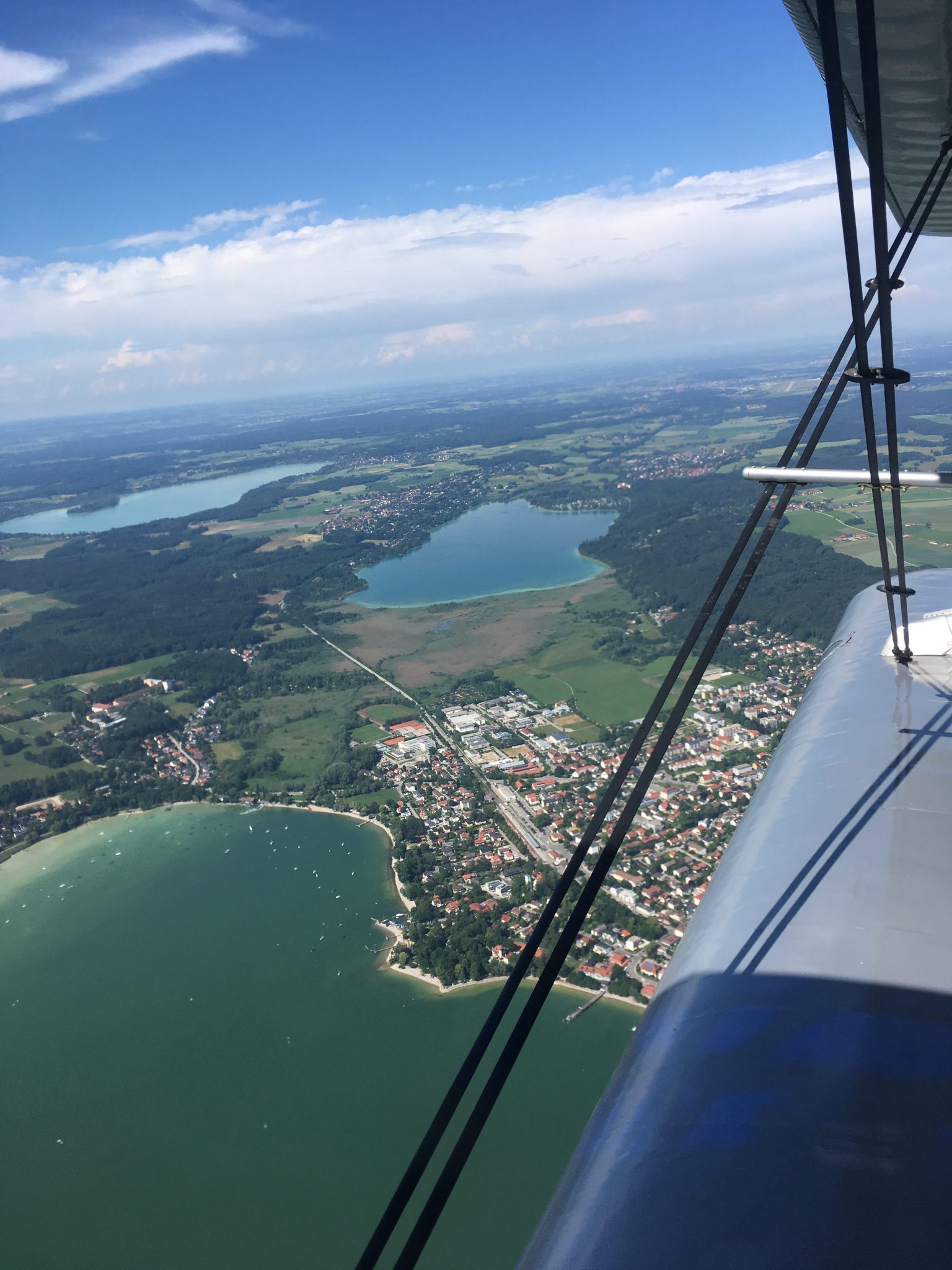 Mit etwa 150 km/h brausen wir auf den Ammersee zu. Der Ausblick von hier oben ist einfach unglaublich!Über dem Südufer des Ammersee