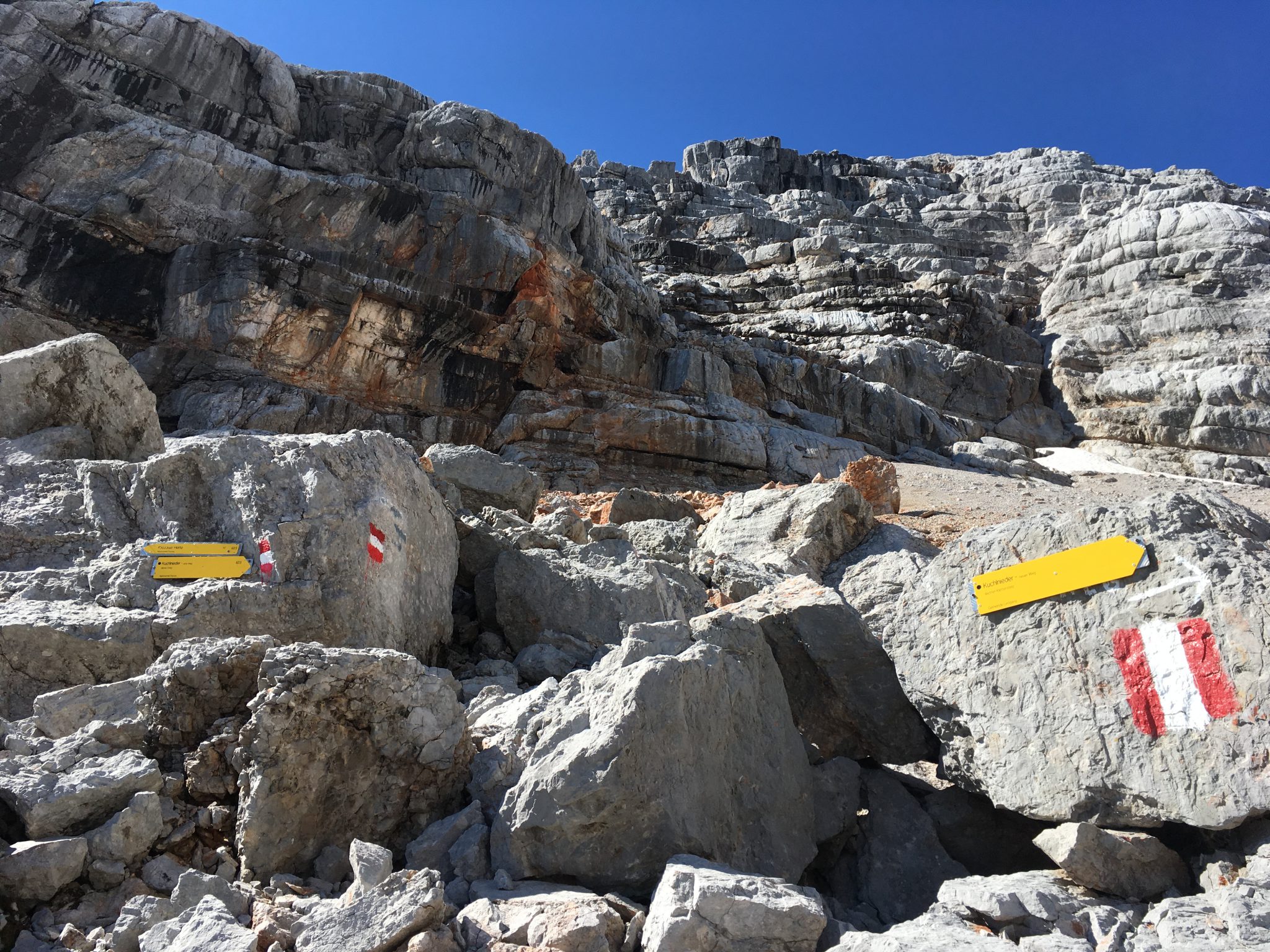 Nach einer kleinen Stärkung geht’s wieder runter, diesmal aber gen Norden. Man schlittert zu Beginn mehr als dass man geht, auf immerhin gut seilgesicherten Schuttbändern.