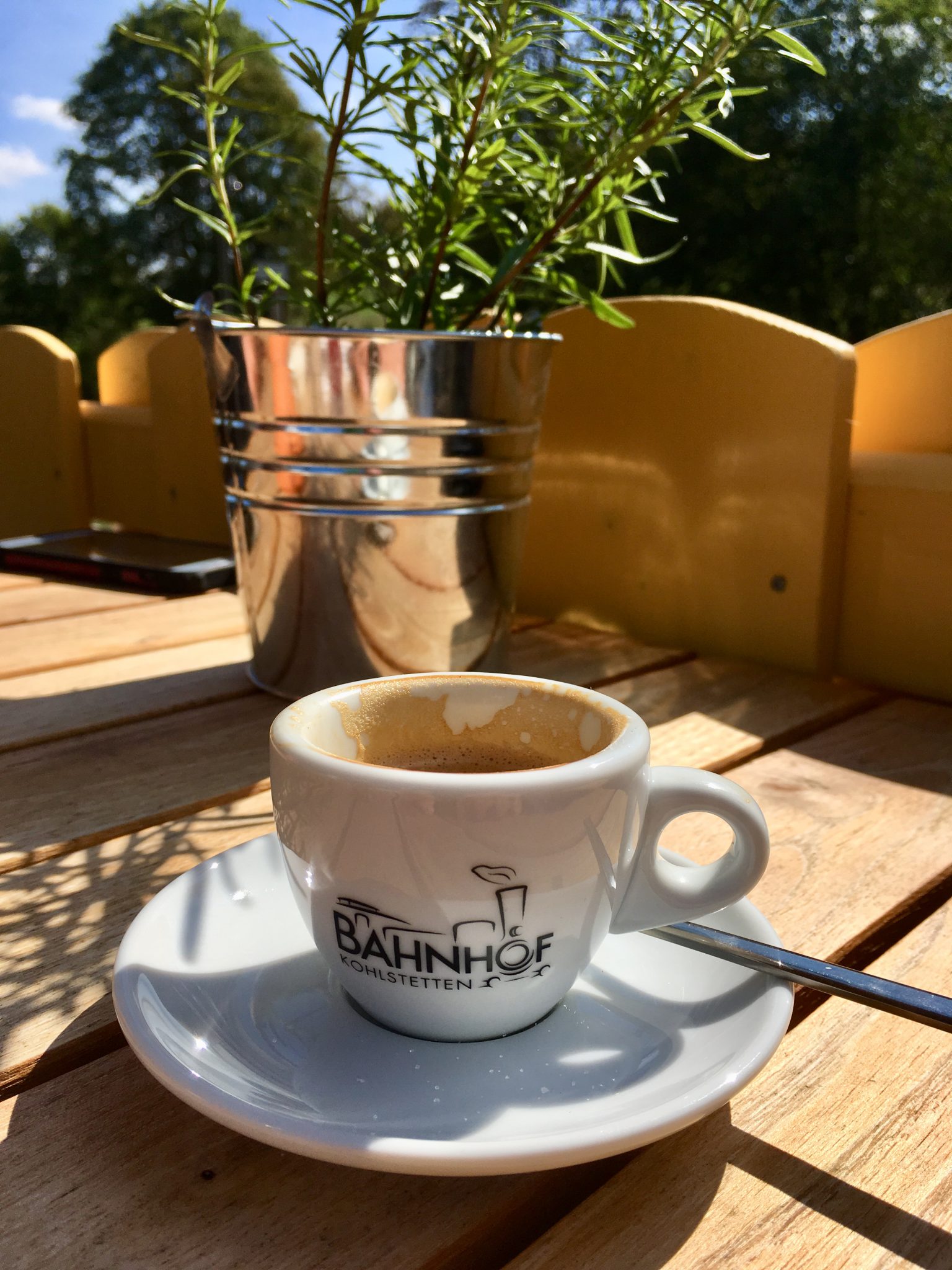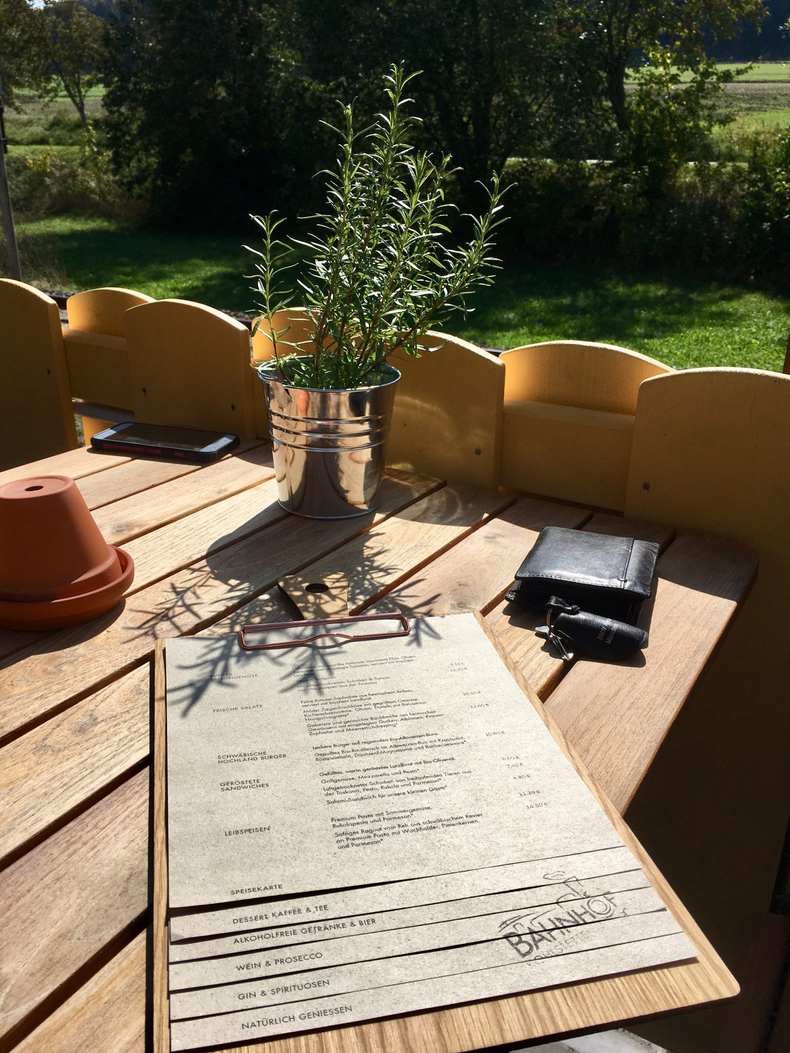 Kurz verschnaufen, jetzt gibt’s eine Pause. In Kohlstetten hat genau heute das Bahnhofsrestaurant wieder aufgemacht – wir sind Gäste Nr. 3 und 4. Wir gönnen uns Burger und Schorle, den Begrüßungs-Sekt müssen wir leider ablehnen, denn wir ahnen schon, was uns gleich erwartet…